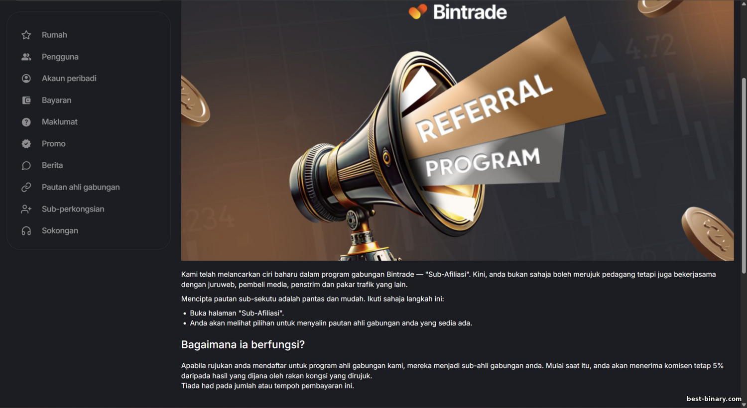 โปรแกรมพันธมิตร BinTrade: ภาพรวมเงื่อนไข RevShare สูงสุด 70%, การจ่ายเงิน และรีวิว (2025)