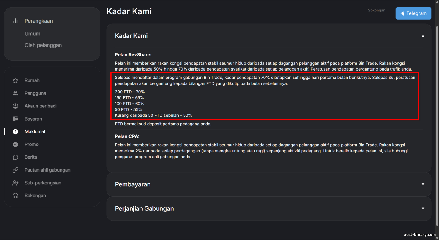 - CPA (Cost Per Action) — โมเดลทางเลือก: จ่ายคงที่เมื่อเกิดแอ็กชันเฉพาะ (มักเป็นการฝากครั้งแรกหรือสมัครพร้อมการเติมเงิน) คู่แข่งบางรายของ BinTrade มี CPA แต่ BinTradeClub ดูจะใช้ RevShare เท่านั้น