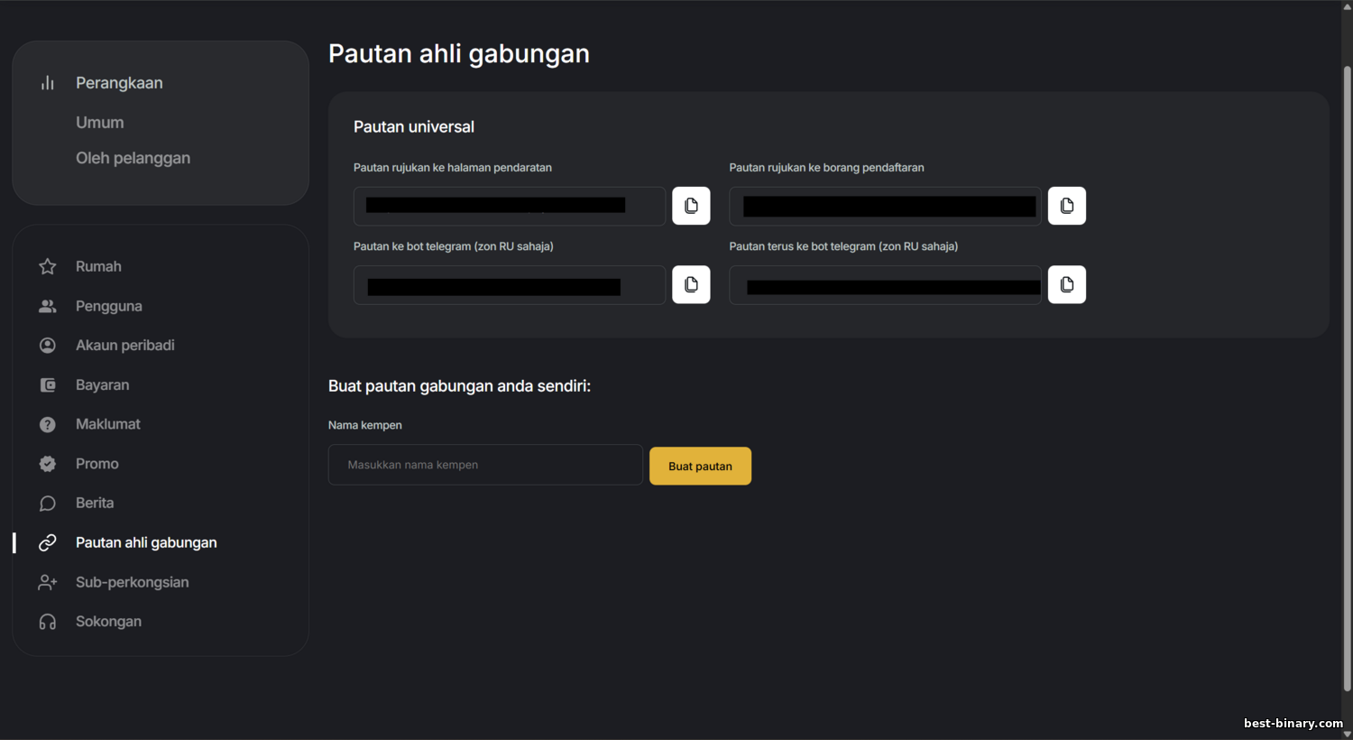 - ขั้นที่ 3 รับลิงก์เรฟเฟอรัลและสื่อโปรโมต เมื่อเข้าแดชบอร์ดแล้ว สร้างลิงก์เรฟเฟอรัลเฉพาะของคุณ มักแสดงในหน้าแรก — ประมาณว่า https://bintradeclub.ru?ref=your_ID ผู้ที่คลิกลิงก์นี้และสมัครจะถูกผูกกับคุณ หากโปรแกรมให้สร้างลิงก์ย่อย (sub‑ID) ใช้เพื่อแยกช่องทางต่าง ๆ ไปที่ส่วน “Promo” เพื่อหาแบนเนอร์หลายขนาดสำหรับดาวน์โหลดหรือคัดลอกโค้ด อาจมีแลนดิงพร้อมใช้ — เลือกให้เหมาะกับทราฟฟิกของคุณ หากเจาะผู้ชมที่ใช้ภาษาอังกฤษ ให้เลือกครีเอทีฟภาษาอังกฤษ (เว็บไซต์ BinTrade รองรับอย่างน้อยรัสเซียและอังกฤษ) คัดลอกลิงก์และโค้ดแบนเนอร์เก็บไว้สำหรับขั้นต่อไป