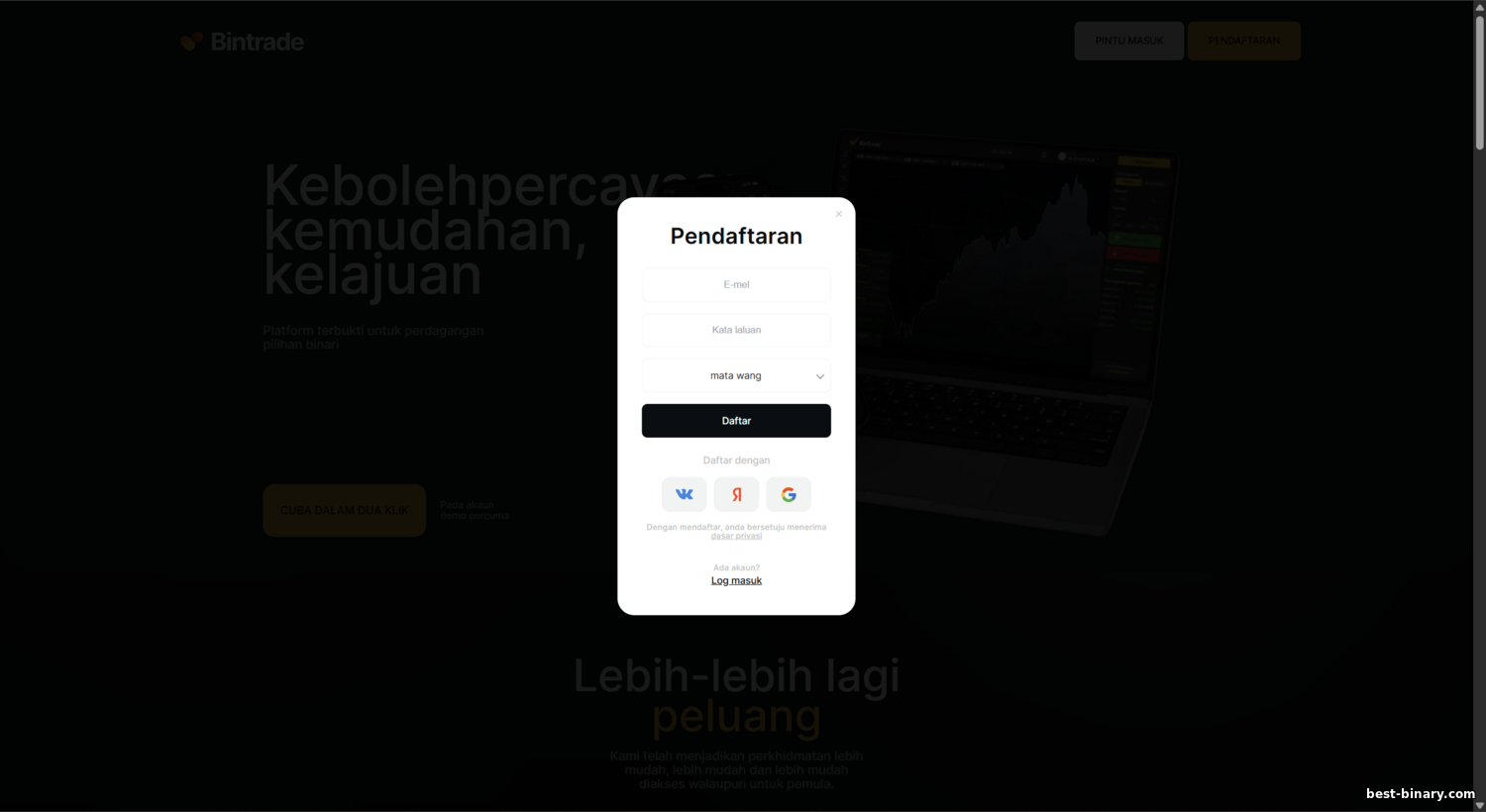 BinTrade เริ่มดำเนินการราวปี 2020 บริษัทวางตำแหน่งตัวเองเป็นแพลตฟอร์มไบนารีสำหรับทำกำไรจากการเคลื่อนไหวของราคาเว็บไซต์ทางการ (เดิม bintradeclub.ru และอีกหลายโดเมน) มุ่งเป้าผู้ใช้ที่พูดภาษารัสเซีย การตลาดของ BinTrade อ้างผลตอบแทนต่อออเดอร์สูงสุด 90% การจ่ายเงินทันใจ และเทอร์มินัลใช้งานสะดวกพร้อมอินดิเคเตอร์หลากหลาย คำกล่าวอ้างเช่นนี้ชวนให้สนใจ: ใครจะไม่อยากได้ผลตอบแทนเกือบครึ่งหนึ่งของเงินลงทุนในไม่กี่นาที?