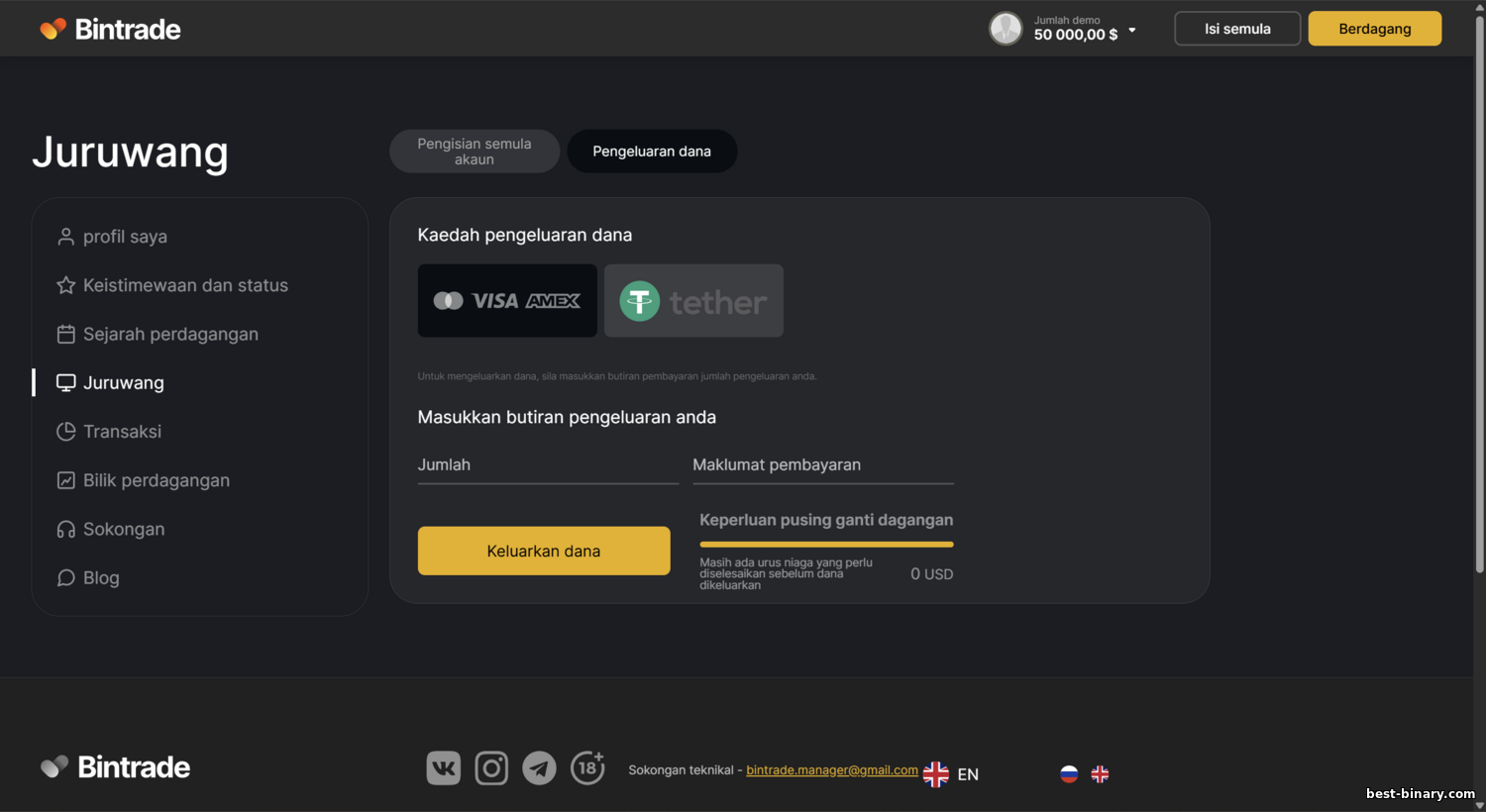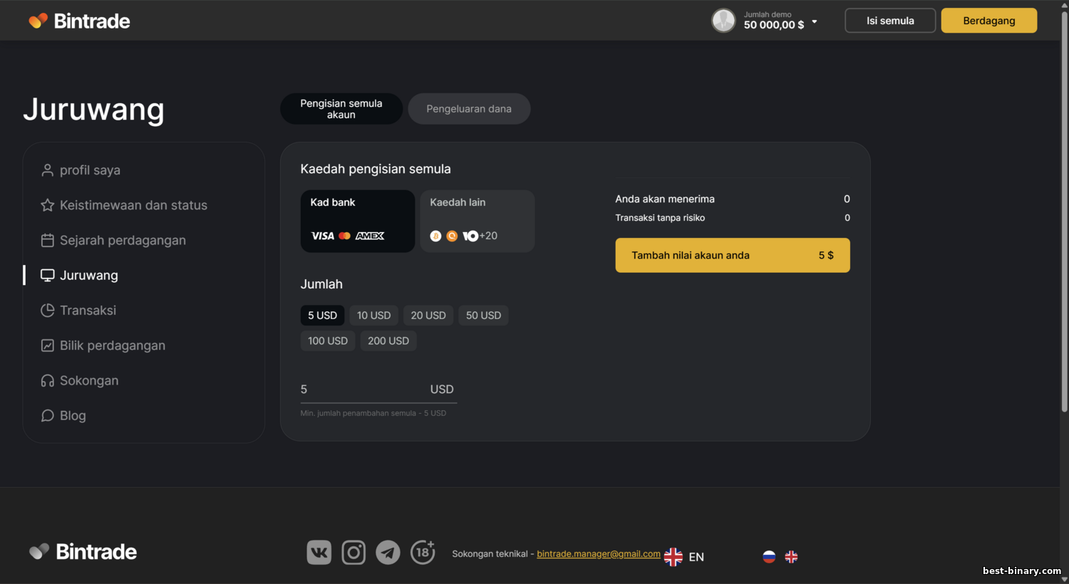 - โบนัสต้อนรับสำหรับการฝากครั้งแรก BinTrade กล่าวถึงระบบโบนัสต้อนรับ แต่รายละเอียดเห็นได้เฉพาะผู้ที่ลงทะเบียน สาธารณะไม่ได้บอกตรง ๆ ว่า “รับ +100% เมื่อฝากครั้งแรก” แต่หลังสมัครอาจมีโค้ดโปรโมชัน ตามธรรมเนียมในอุตสาหกรรม คาดว่า 30–50% ของยอดฝากแรก เช่น ฝาก 1,000 รูเบิล และโบรกเกอร์เพิ่ม 500 รูเบิล เป็น 1,500 แต่โบนัสมาพร้อมเงื่อนไขการเทิร์นโอเวอร์: ต้องสร้างปริมาณการเทรดหลายสิบเท่าของโบนัสก่อนถอนได้ หากไม่ถึง จะตัดโบนัสตอนถอน — บางครั้งแม้กำไรที่ได้ด้วยโบนัสก็ถูกยกเลิก เราไม่พบตัวเลขเฉพาะของ BinTrade; โดยทั่วไปมัก 30–40× ก่อนรับโบนัสควรถามซัพพอร์ตเรื่องเงื่อนไข และอ่านให้ครบ โบนัสอาจล็อกการถอนเงินของคุณเองจนกว่าจะถึงเทิร์นโอเวอร์ นักเทรดมากประสบการณ์จำนวนมากเลือกไม่รับโบนัส
