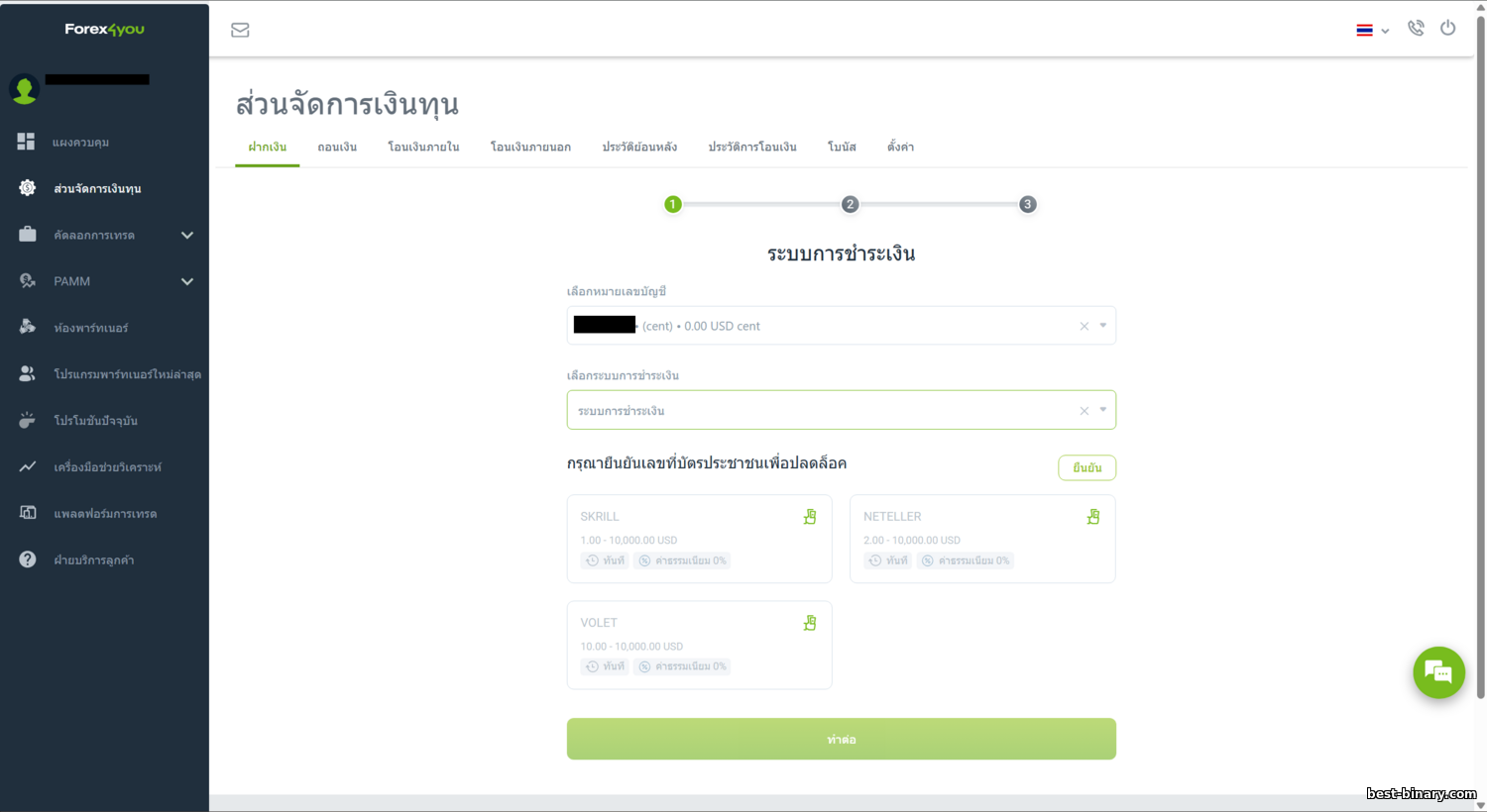 Forex4you รองรับตัวเลือกการฝากที่หลากหลายเพื่อให้เข้ากับความนิยมระดับภูมิภาค มี Visa/Mastercard โอนผ่านธนาคาร (SWIFT) อีวอลเล็ต และแม้แต่คริปโต อีวอลเล็ตที่รองรับ เช่น Skrill, Neteller, WebMoney, QIWI, YooMoney, FasaPay, Perfect Money เป็นต้น เช่น ฝากผ่าน WebMoney หรือ Skrill จะเข้าทันที; ขั้นต่ำ $1; ค่าธรรมเนียมฝั่งโบรกเกอร์ 0% บัตรมักมีขั้นต่ำ $10–20; เงินเข้าทันทีหรือภายในชั่วโมง; ค่าธรรมเนียมโบรกเกอร์ 0% (ธนาคารคุณอาจคิด ~2.5%) ช่องทางท้องถิ่นมีให้ในบางภูมิภาค: ธนาคารท้องถิ่นในเอเชียตะวันออกเฉียงใต้ ออนไลน์แบงก์กิงในอินเดีย และบริการภูมิภาคในละตินอเมริกา แคบบิเน็ตจะแสดงรายการเต็มสำหรับประเทศของคุณ ธุรกรรมทั้งหมดปลอดภัย (SSL); สกุลเงินบัญชีโดยทั่วไปเป็น USD; สกุลเงินอื่นจะแปลงตามอัตราระบบ ด้วยการไม่มีขั้นต่ำ — แม้ $1 — จึงดึงดูดมือใหม่