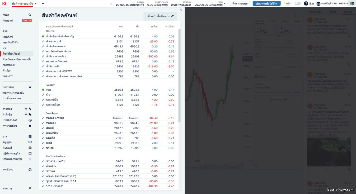 IG ครอบคลุมตลาดสินค้าโภคภัณฑ์หลักทั้งหมดผ่าน CFD: พลังงาน (WTI, Brent, ก๊าซธรรมชาติ น้ำมันเบนซิน) โลหะมีค่าและอุตสาหกรรม (ทอง เงิน แพลทินัม ทองแดง ฯลฯ) และเกษตร (ข้าวสาลี ข้าวโพด น้ำตาล กาแฟ ฝ้าย ฯลฯ) รวม 39 ตลาด เทรดได้ทั้งสปอต (มีค่าพักข้ามคืน) หรือฟอร์เวิร์ดมีวันหมดอายุ (เช่น น้ำมันเดือนหน้า) สเปรดตึง: ทอง ~0.3 น้ำมัน ~$0.02–0.04 เลเวอเรจรีเทลทั่วไป 1:20 บนทอง 1:10 บนน้ำมัน (ตาม ESMA); สูงกว่านี้สำหรับมืออาชีพ/นอกฝั่ง ช่วงเทรดตามตลาด โลหะ/พลังงานเกือบ 24/5