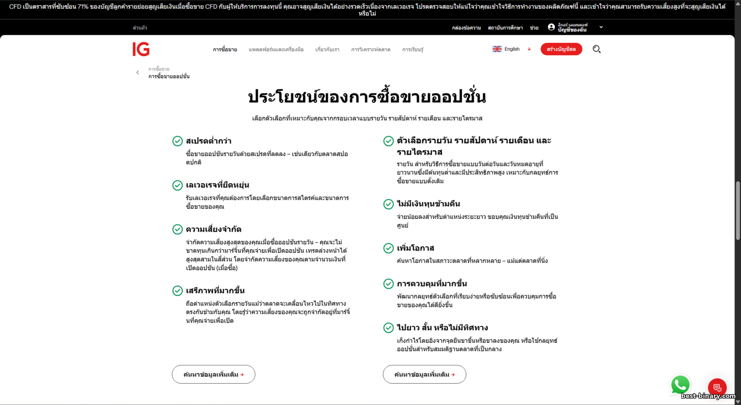 - บาเรีย (Knock-out) ออปชัน — ผลิตภัณฑ์เอกลักษณ์ของ IG คุณตั้งระดับบาเรีย หากราคาวิ่งสวนและแตะระดับนั้น สถานะจะน็อกเอาต์ ขาดทุนจำกัดเท่าพรีเมียม หากราคาไปทางคุณ คุณออกเมื่อไรก็ได้หรือถือต่อ การกำหนดราคาติดตามสินทรัพย์อ้างอิงแบบหนึ่งต่อหนึ่ง ทำให้ติดตามง่าย ระยะห่างบาเรียกำหนดเลเวอเรจโดยปริยาย (บาเรียใกล้ = เลเวอเรจสูง) บาเรียเป็นทางเลือกบริหารความเสี่ยงในตัวแทน CFD ความพร้อมใช้งานใกล้เคียงกับวานิลลาในยุโรป