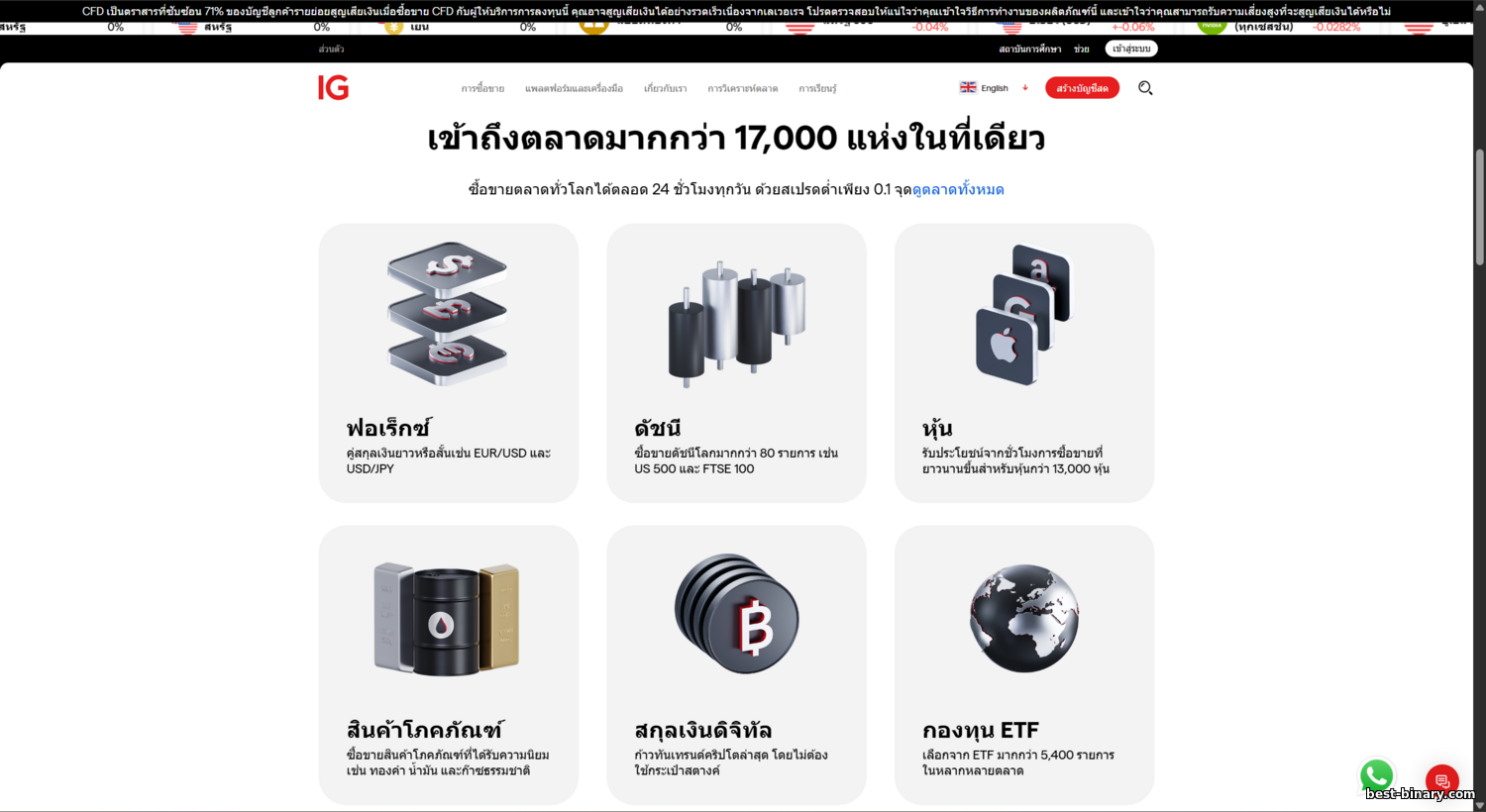 IG มีชื่อเสียงเรื่องใดและให้บริการอะไรบ้าง? IG เป็นผู้บุกเบิกสเปรดเบ็ตติ้งทางการเงิน — ย้อนกลับไปทศวรรษ 1970 ที่เปิดโอกาสให้ลูกค้าเก็งกำไรการเคลื่อนไหวราคาทองในช่วงที่การถือครองทองถูกจำกัด ทุกวันนี้ IG เป็นโบรกเกอร์หลายสินทรัพย์ มีผลิตภัณฑ์ Forex และ CFD ครอบคลุมทุกสินทรัพย์หลัก (สกุลเงิน หุ้น ดัชนี สินค้าโภคภัณฑ์ คริปโต ฯลฯ) การเข้าถึงหุ้นและ ETF จริงสำหรับบางประเทศ ออปชัน และเครื่องมือภายในที่เป็นนวัตกรรม เช่น IG สร้าง Turbo24 — ใบสำคัญแสดงสิทธิแบบเทอร์โบที่ซื้อขายในตลาดได้ตลอด 24 ชม. 5 วัน/สัปดาห์ เป็นรายแรกของโลก Turbo24 ช่วยให้เทรดเดอร์ยุโรปตั้งค่าบาเรีย (น็อกเอาต์) เพื่อจำกัดความเสี่ยงและกำหนดเลเวอเรจได้อย่างมีประสิทธิภาพ IG ยังมีออปชันวานิลลาและบาเรียบน FX ดัชนี และสินค้าโภคภัณฑ์ — สำหรับลูกค้าในหลายประเทศยุโรป ในสหราชอาณาจักรและไอร์แลนด์ IG ให้บริการสเปรดเบ็ตติ้งแบบดั้งเดิม — วิธีเก็งกำไรที่มีประสิทธิภาพด้านภาษีและเป็นที่นิยมในหมู่เทรดเดอร์อังกฤษ