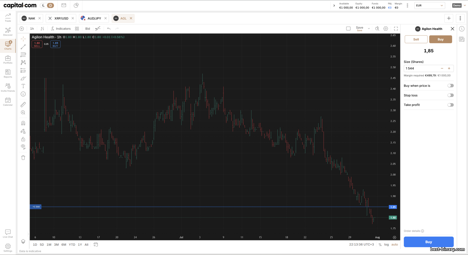 - กราฟและเทคนิคอล: สไตล์ใกล้เคียง TradingView พร้อมอินดิเคเตอร์ 75+ และเครื่องมือวาด (เส้นแนวโน้ม ฟีโบนัชชี รูปทรง ป้ายกำกับ) เปิดหลายสินทรัพย์คนละแท็บ กรอบเวลา 1 นาทีถึง 1 เดือน ประเภทกราฟ: แท่งเทียน แท่ง เส้น Heikin‑Ashi; มี Sentiment และแกนเพิ่มเติม