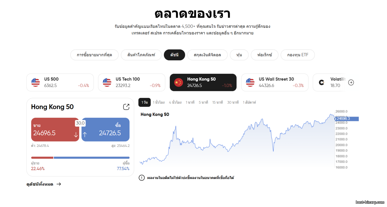 - ดัชนี: ~40 ดัชนีหุ้นทั่วโลก เทรด CFD บน US 500 (S&P 500), US‑TECH 100 (Nasdaq), Dow Jones 30, Germany 40 (DAX), Euro Stoxx 50, UK 100 (FTSE), Japan 225 (Nikkei), China 50 ฯลฯ สเปรดโดยทั่วไป: US 500 ~0.5–0.7 จุด, Germany 40 ~1 จุด, FTSE 100 ~1 จุด เลเวอเรจสูงสุด 1:20 (EU)