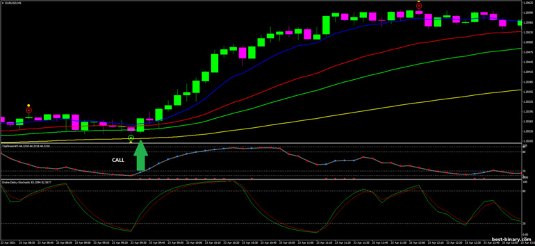 - การซื้อออปชั่นเมื่อเส้น Stochastic และ TopDream ที่มีจุดสีน้ำเงินเพิ่มขึ้น